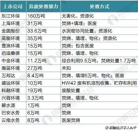 目前,A股上市企业中,有50家(数据来自同花顺)涉及到固废处理业务,从互联网获得的信息,截至2017年底,东江环保每年工业及市政废物综合利用与处理处置能力逾370万吨,在全国危废行业领先优势明显,具备44类危险废物经营资质,拥有危废处置能力逾160万吨。